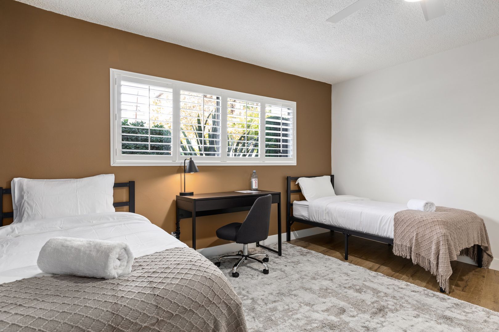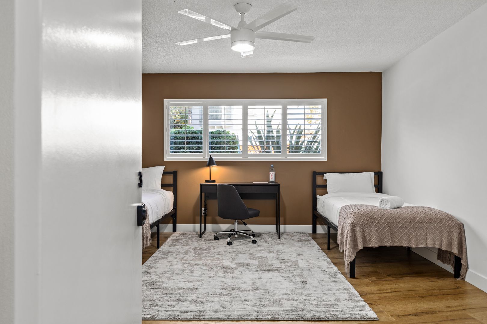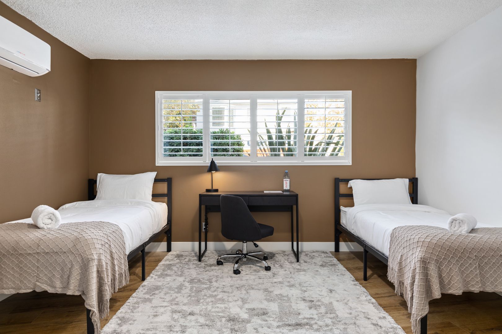 • A 192 sq ft twin room with wood flooring and common bathroom.