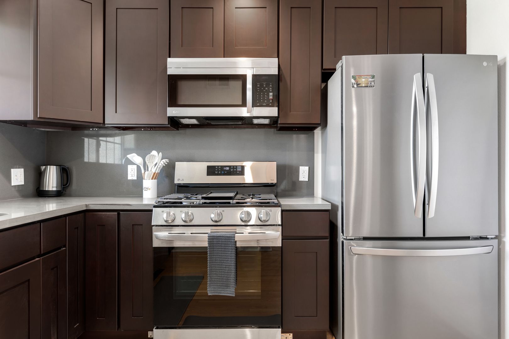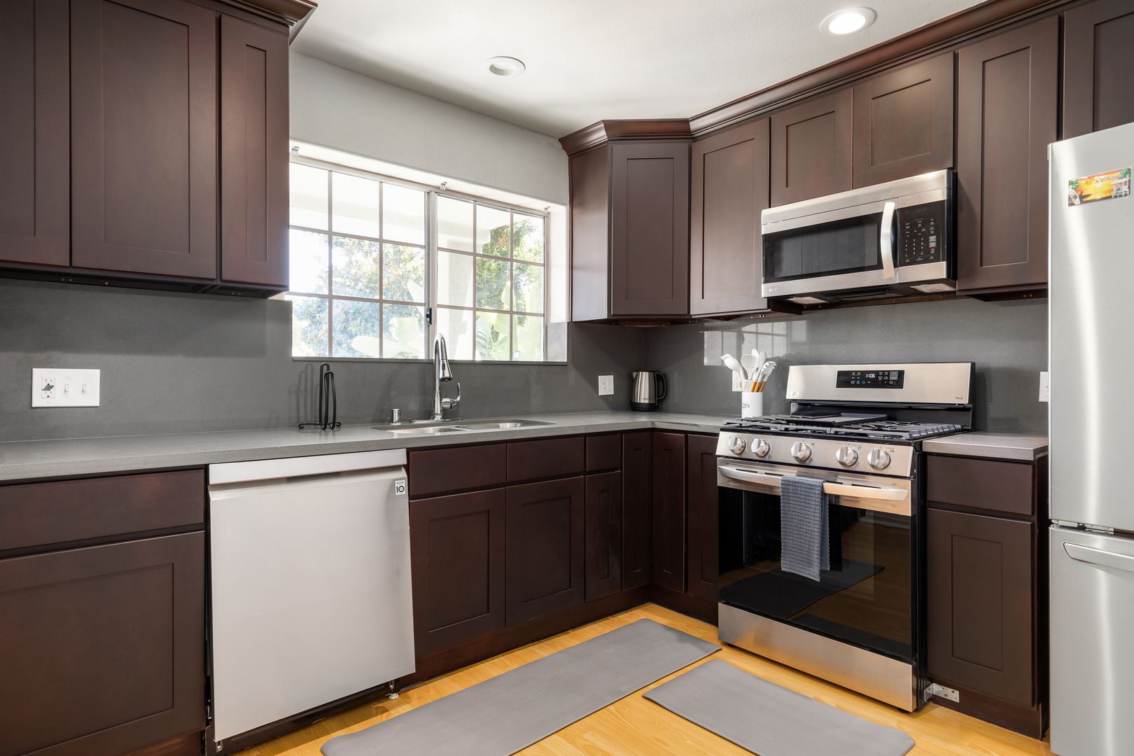 • Has a fully functional kitchen with refrigerator, stove top, and oven provided for your convenience.