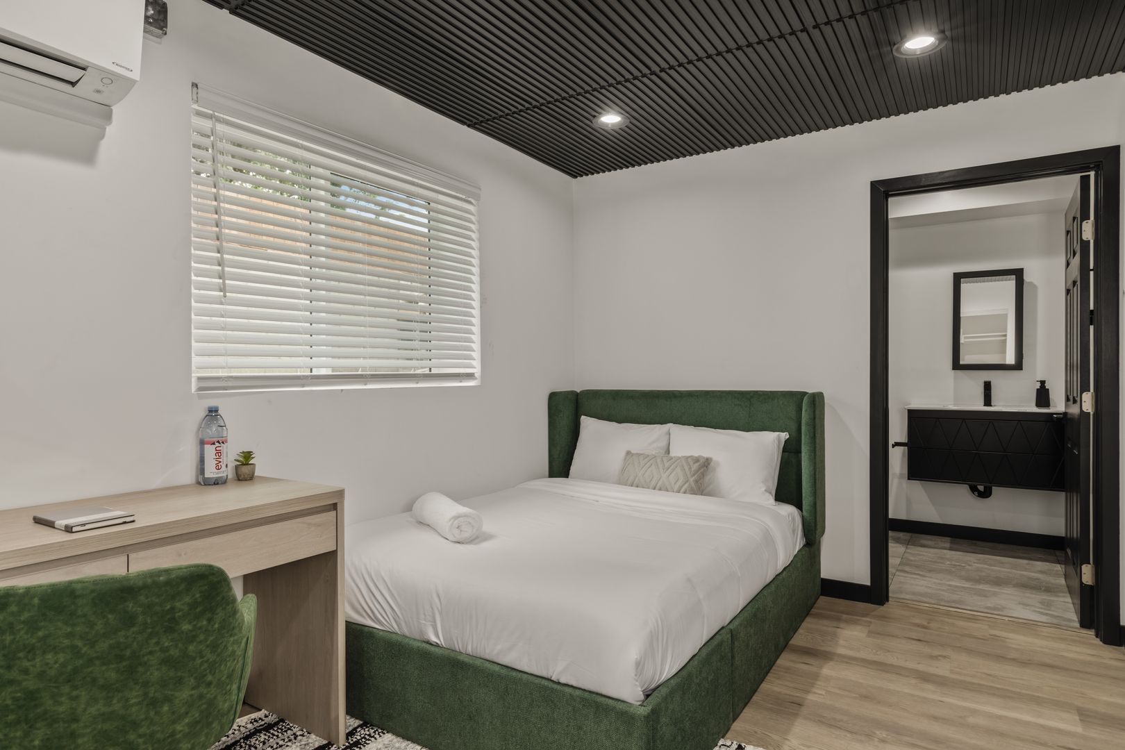 • A 160 sq ft private room with wood flooring and a common bathroom.