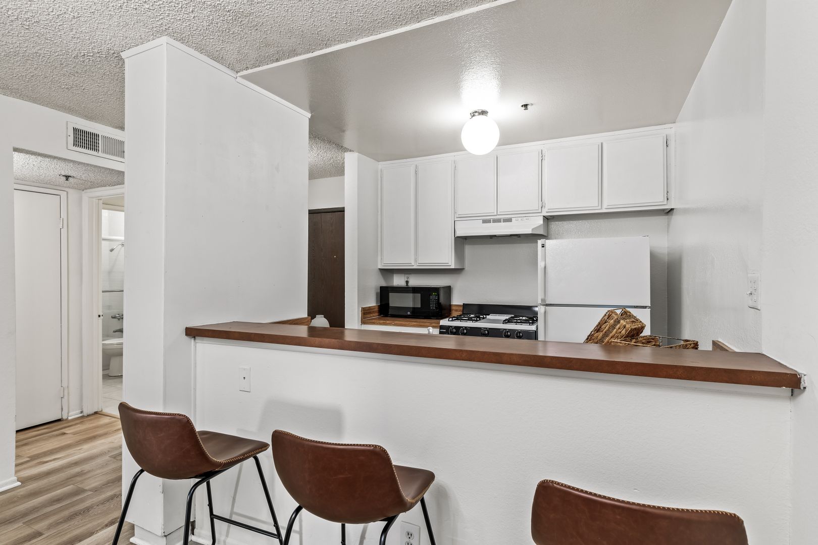 • Has a fully functional kitchen with refrigerator, stove top, and oven provided for your convenience.