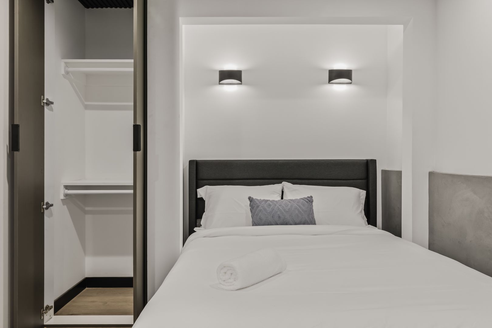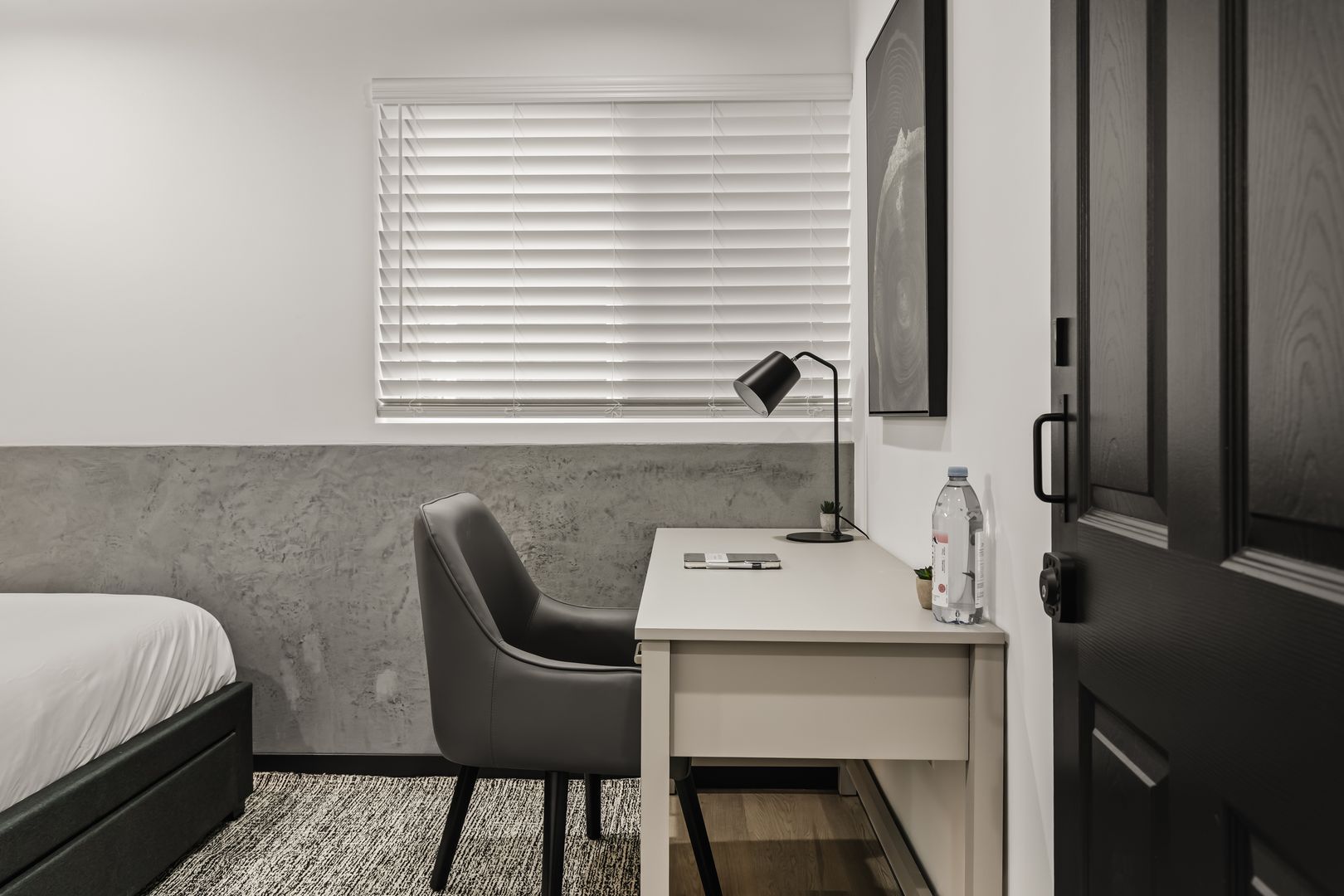 • Includes a full-size bed, desk and closet.