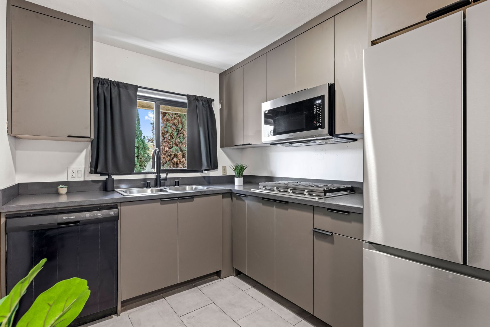 • Has a fully functional kitchen with refrigerator, stove top, and oven provided for your convenience.