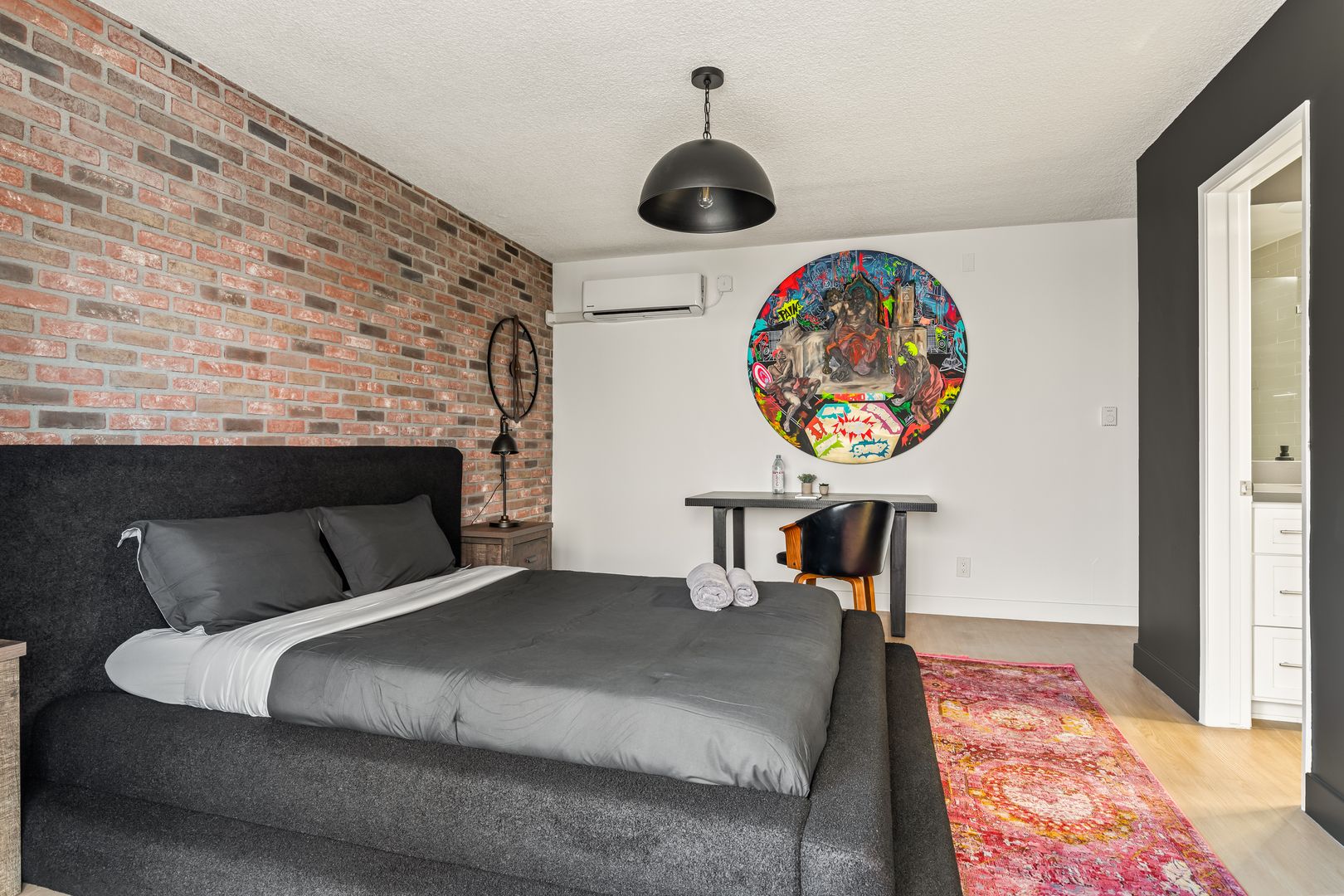 • Includes a queen-size bed, desk, and closet.