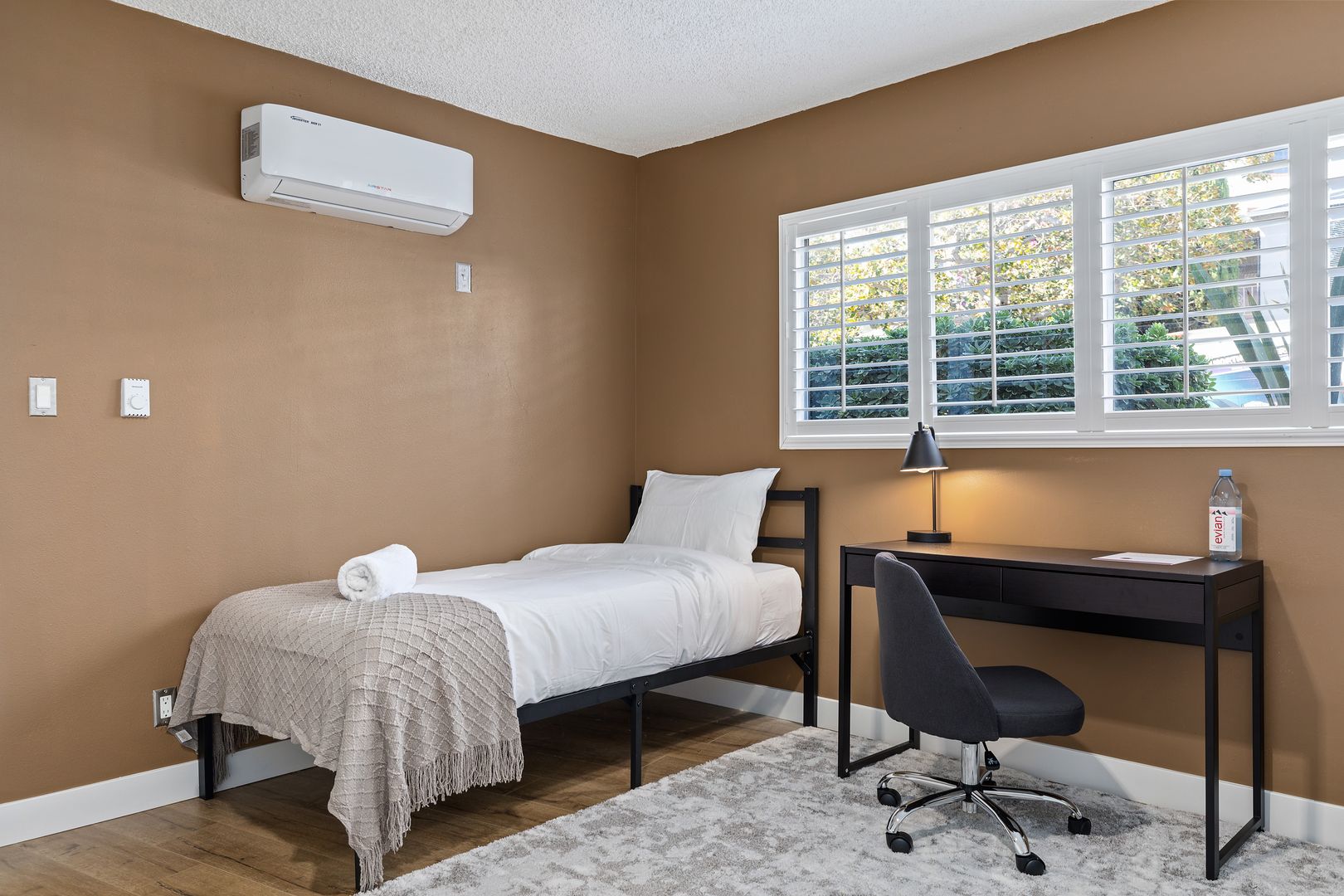• Includes a twin-sized bed, regular closet, and desk.
