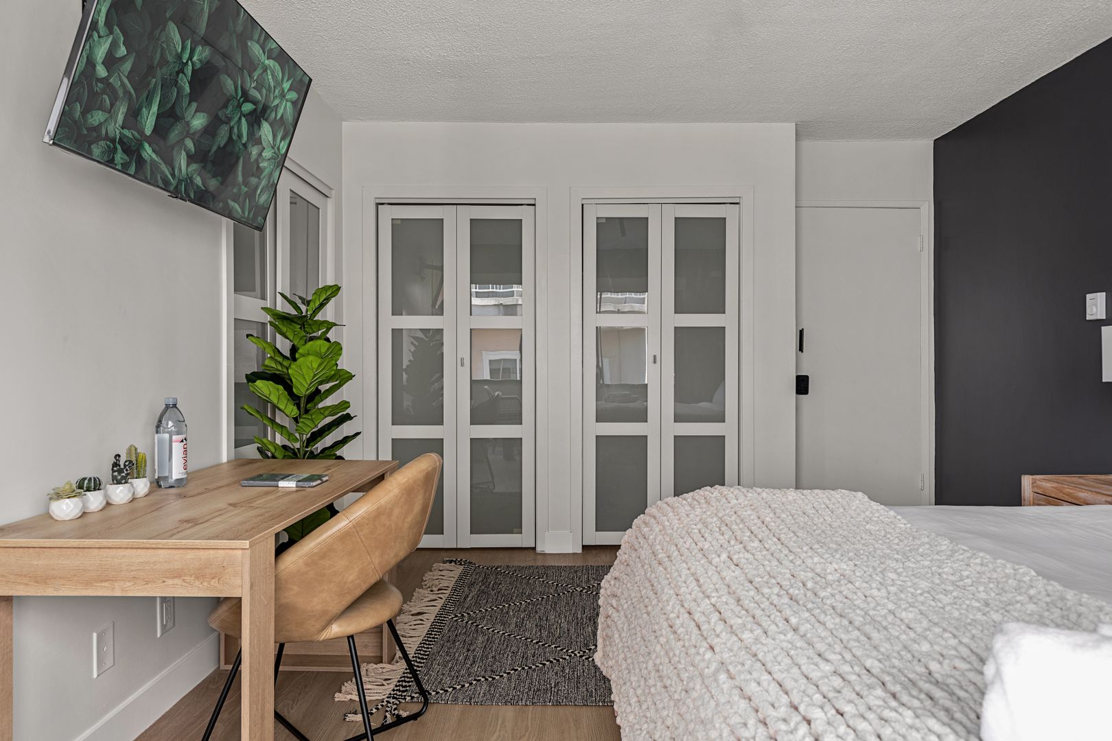 • Includes a king-size bed, desk, and closet.
