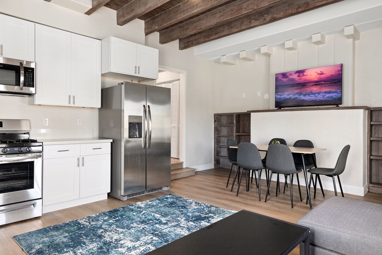 • Has a fully functional kitchen with refrigerator, stovetop, and oven provided for your convenience.